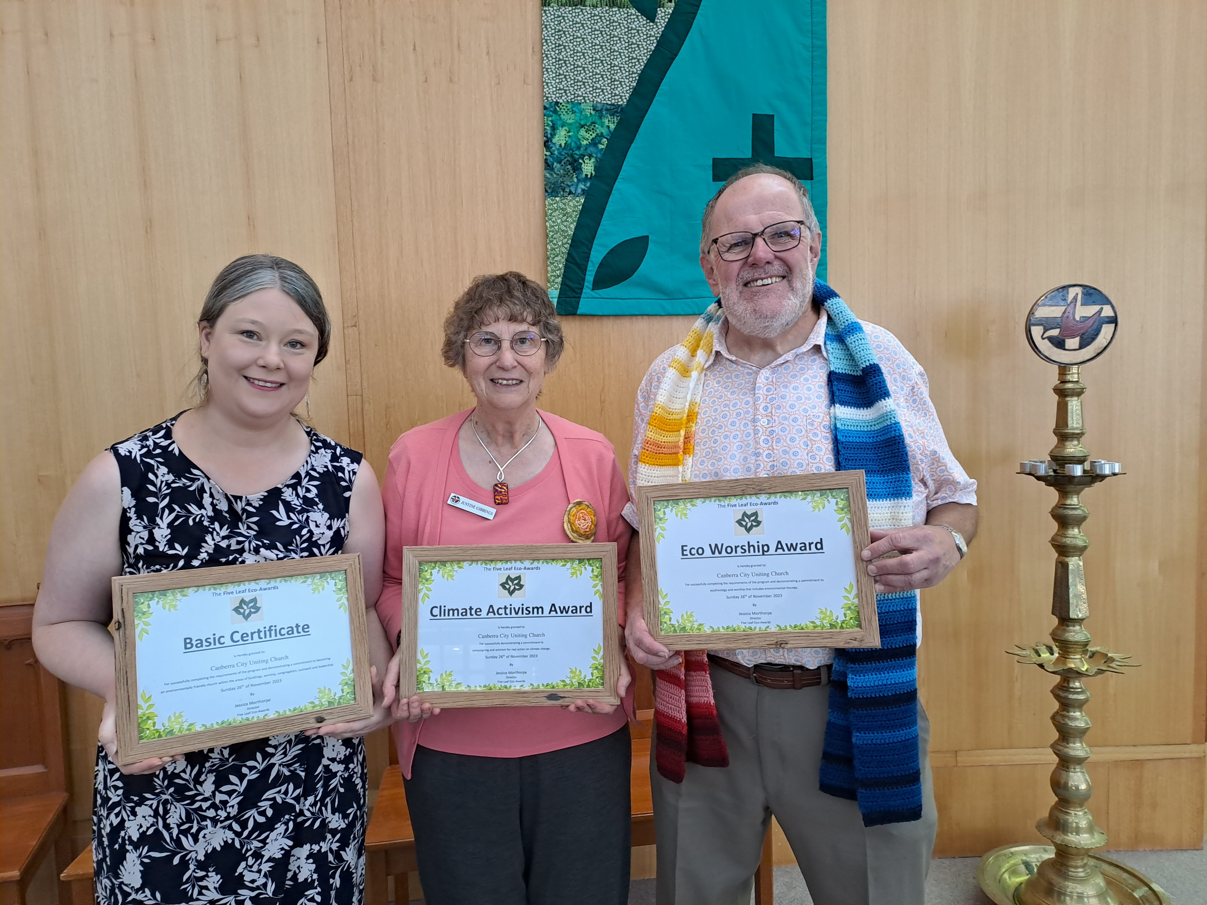 Jessica Morthorpe, Founder and Director of the awards program, travelled to Canberra to present the awards. “It’s really wonderful to recognise the decades of work this congregation has been doing for the environment. We first recognised their eco worship in 2011, but they have achieved so much more since then, and it’s an honour to also recognise the incredible leadership of Rev. Paul Chalson in the spaces of environment themed worship, ecotheology and climate action. This is at least the second congregation where his ministry has contributed to the church receiving awards.”