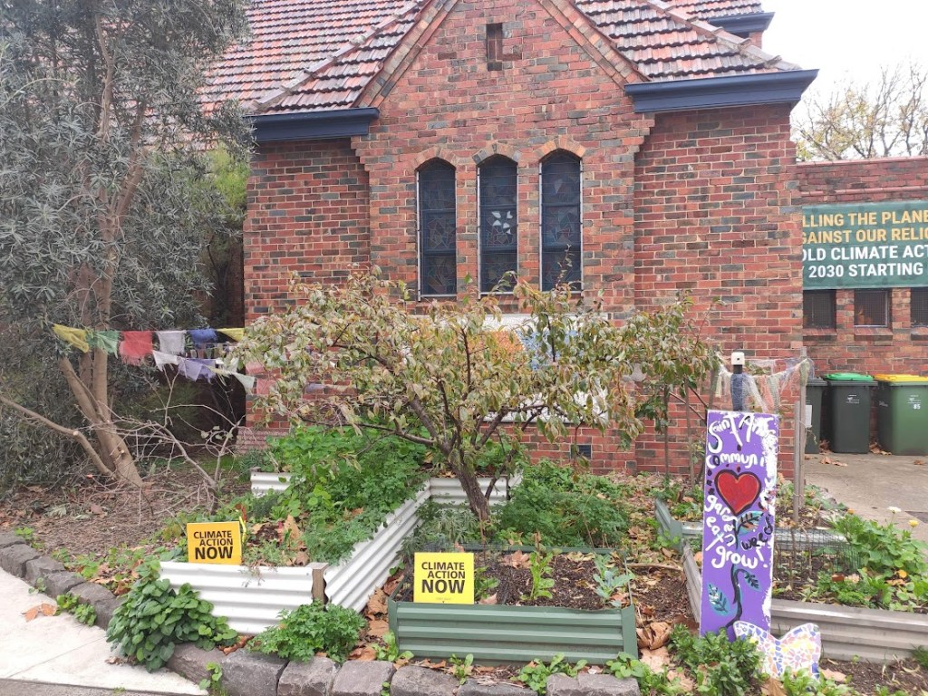 Signage on the western façade of the church clearly expresses its commitment to mother earth, saying, “Killing the Planet is against our Religion. Bold climate action by 2030 starting now”. A small produce garden of fruit trees, herbs and vegetables flourishes nearby.